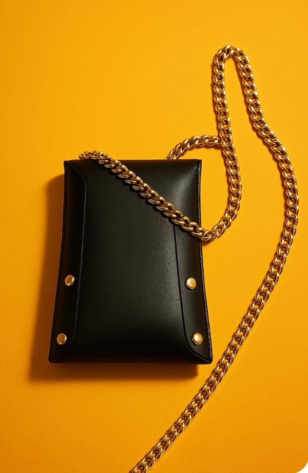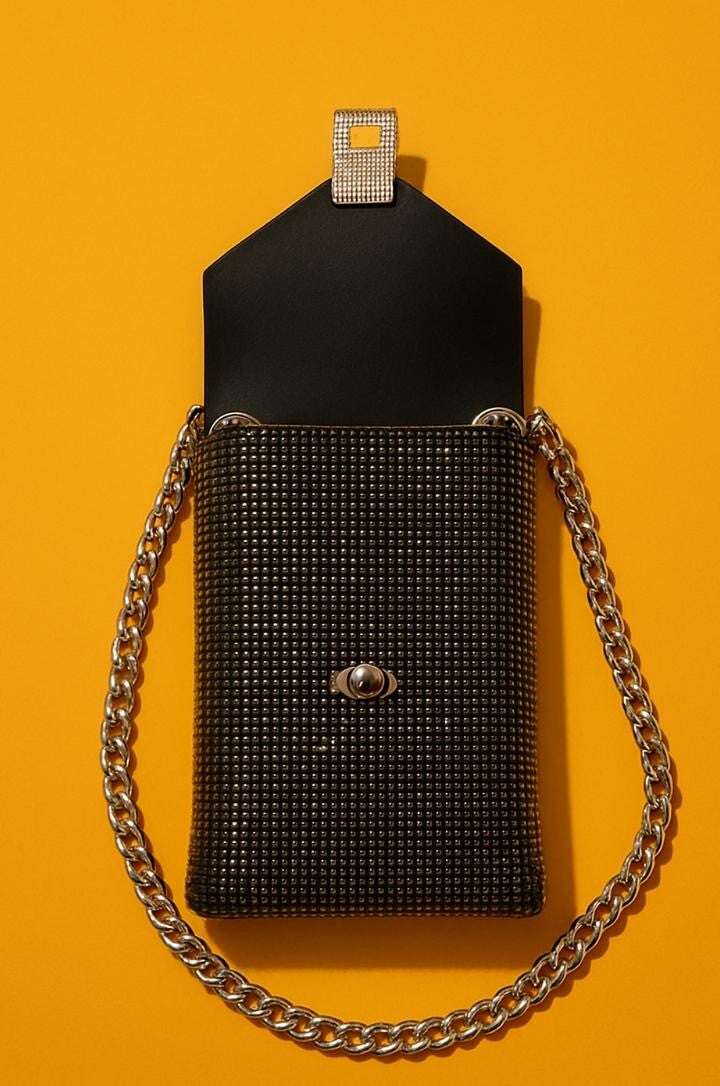 Questa è una borsa elegante, dal design raffinato. È realizzata in un materiale nero con una texture fine che ricorda delle piccole pietre brillanti, conferendole un aspetto scintillante. La chiusura della borsa è semplice ed elegante, con un piccolo bottone dorato quadrato che aggiunge un tocco di classe. La tracolla è composta da una catena metallica argentata che completa il look sofisticato e moderno. Il contrasto tra il nero della borsa e la catena argentata crea un bellissimo equilibrio visivo, rendendola ideale per occasioni speciali o serate eleganti.